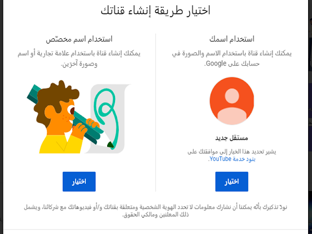 - يمكنك بعد ذلك اختيار إنشاء قناة شخصية أو قناة باستخدام اسم شركتك أو اسم آخر.